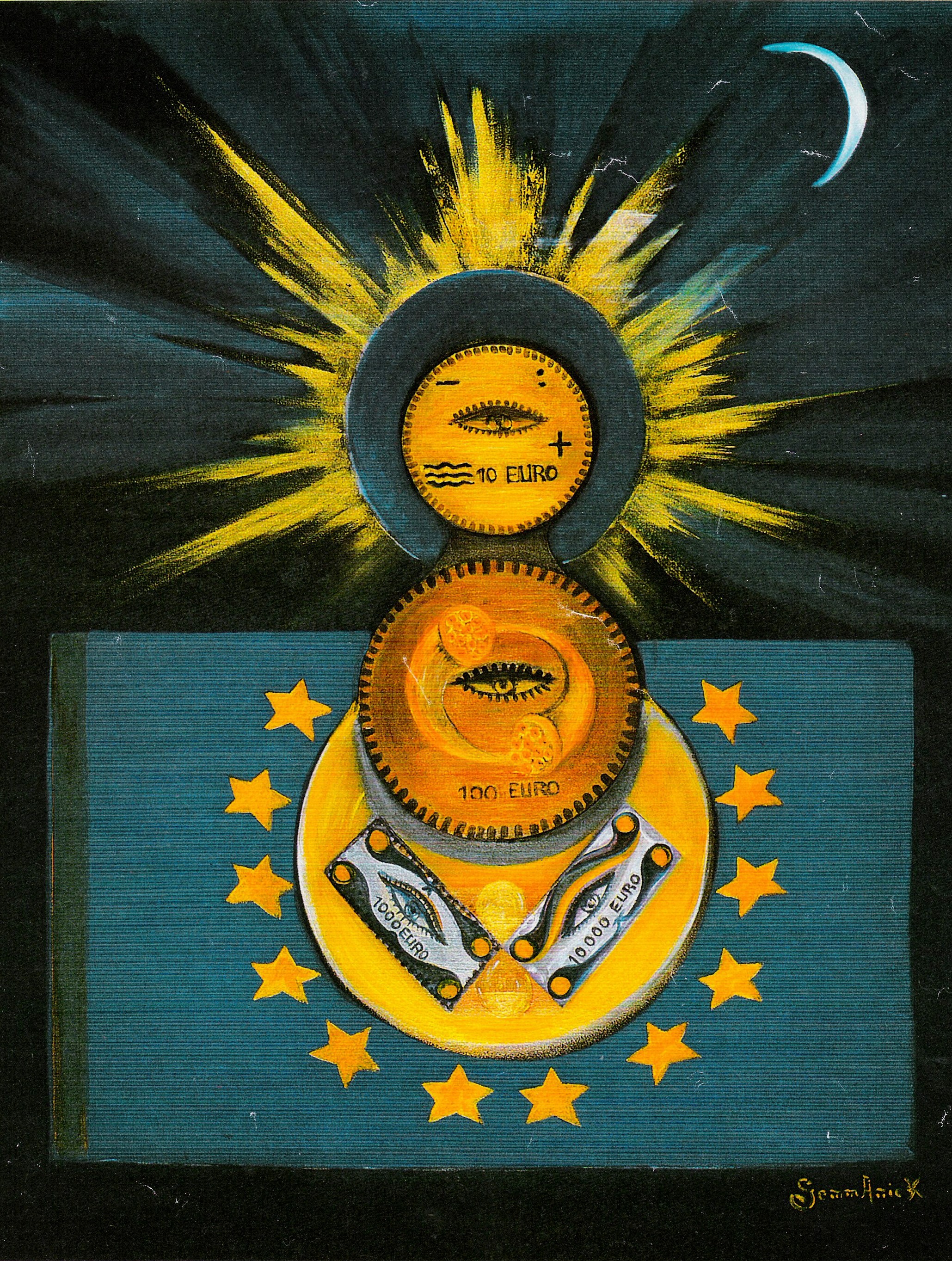 Dans une toile qu’elle intitule La Conscience de l’Europe, Gemmanick frappe la monnaie unique de la CEE du sigle EURO, pour Europe Unie Réalisée dans l’Ouverture, à une époque où tout le monde croit à la pérennité de l’Ecu…