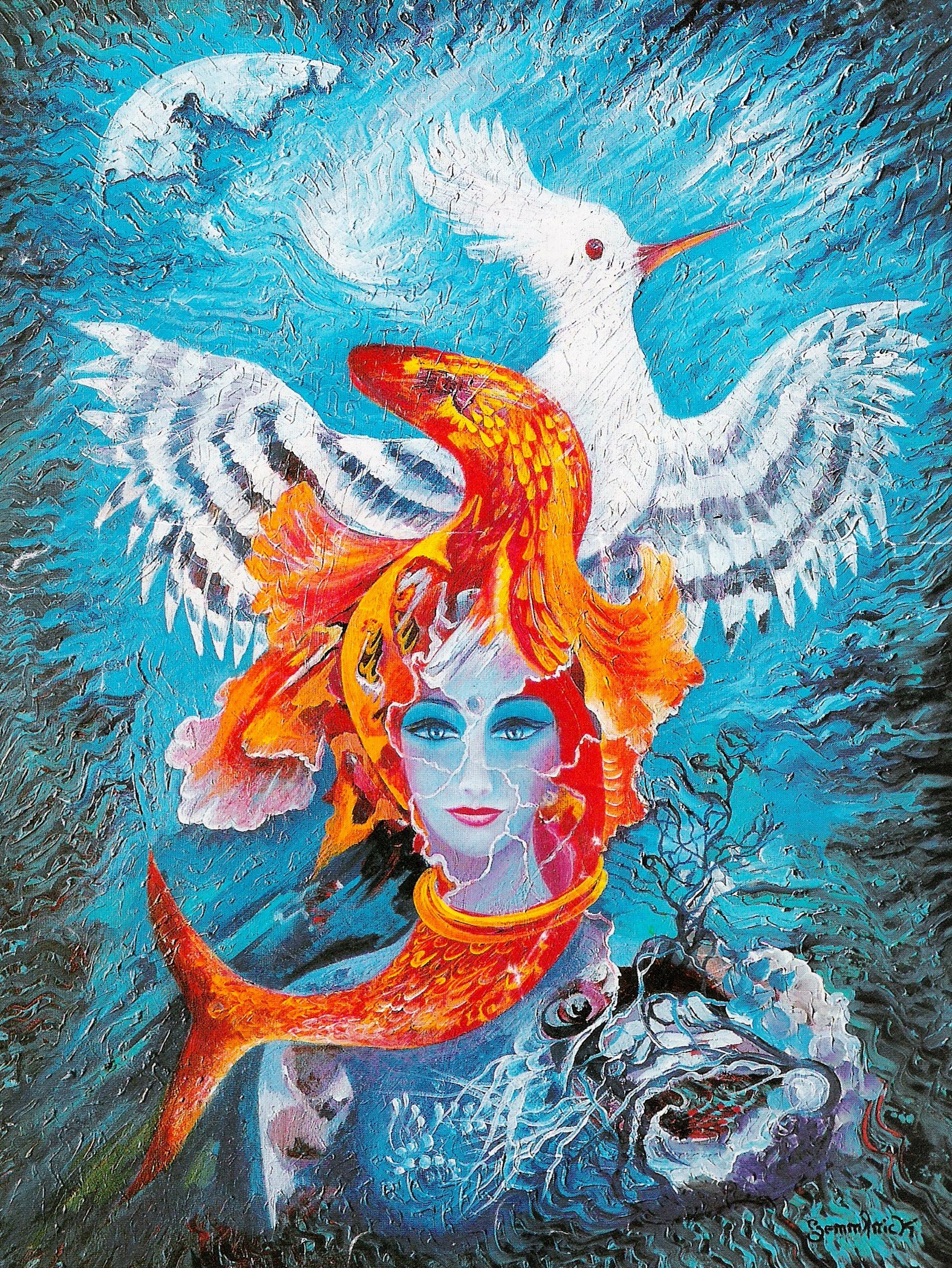 Porteuse du liquide amniotique qui donne la vie sur terre, la femme est en symbiose, point de rencontre entre l’eau et la terre, l’unité et la dualité, l’âme et son véhicule terrestre…